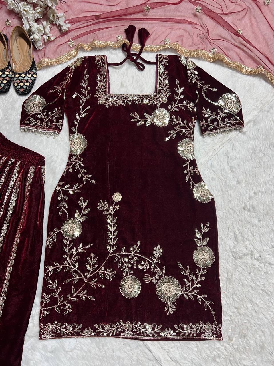 Pure heavy viscous velvet outfit with rich multi-needle embroidery and sequence work. Fully stitched sharara and embroidered butterfly net dupatta with four-side lace border. Inner micro cotton for comfort. Available in sizes Mโ€“XXL. Perfect for festive and party wear.